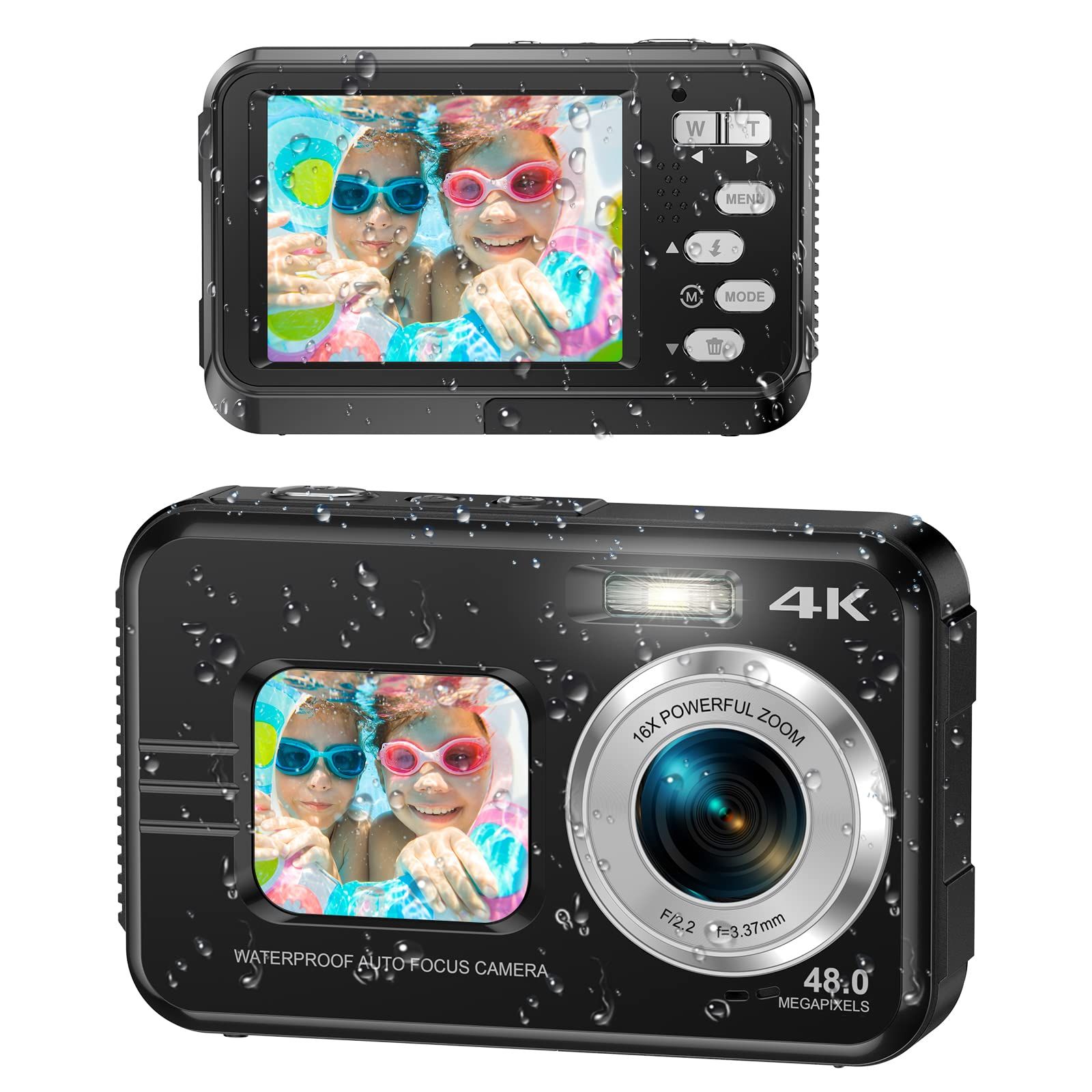 4K Camera Underwater Waterproof Selfie Dual Screen Snorkeling 48MP Autofocus 16X Zoom Portable 11FT Photography Adventure 2 Battery Black