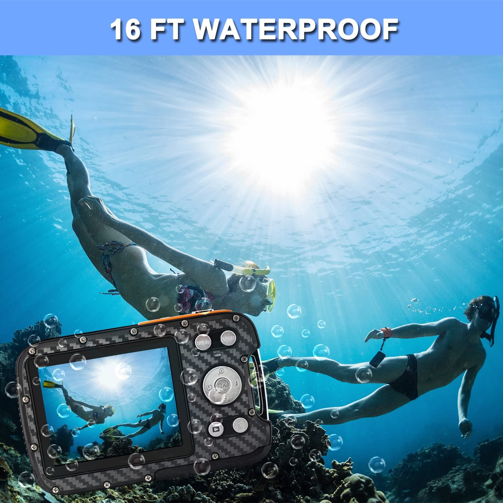 16FT Underwater Camera 30MP Waterproof Digital Camera with 32G Card and Rechargeable Battery,18X Point and Shoot Camera (Orange)
