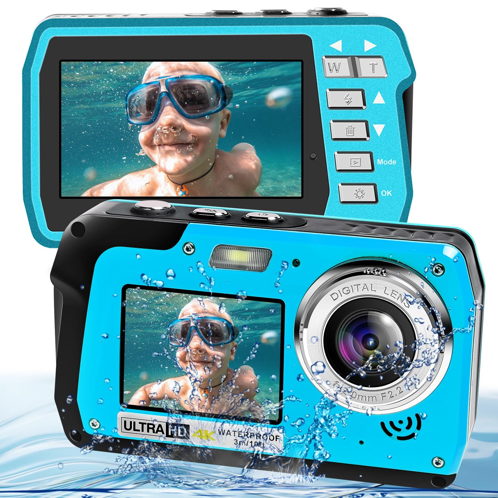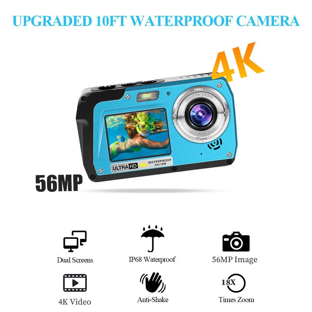 4K 30FPS Waterproof Camera 56MP Underwater Cameras UHD Video Recorder Selfie IPS Dual Screens 10FT Waterproof Digital Camera (Blue)