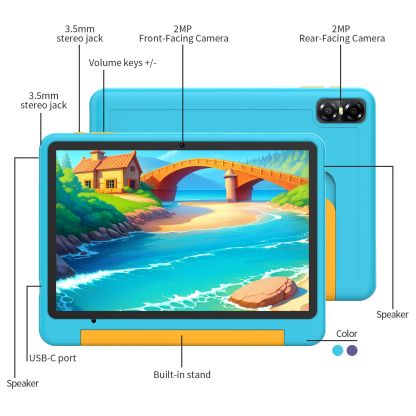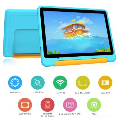10.1 Inch Android 14 Tablet with 1280 x 800 HD Display,8GB RAM 32GB ROM,WiFi,Bluetooth,Dual Camera,Parental Control for Boys and Girls(Blue)