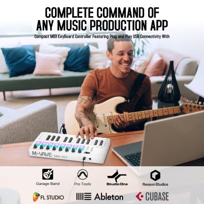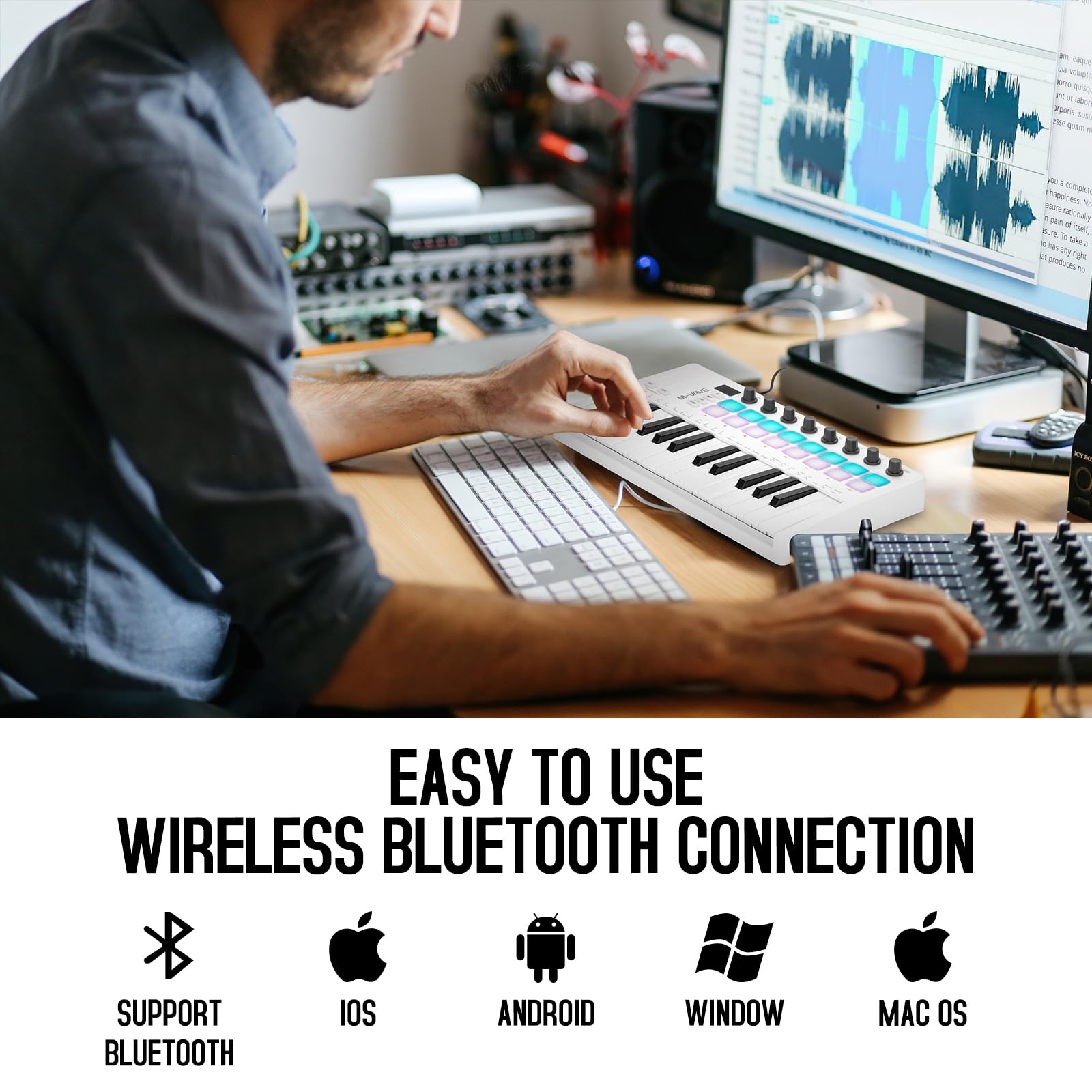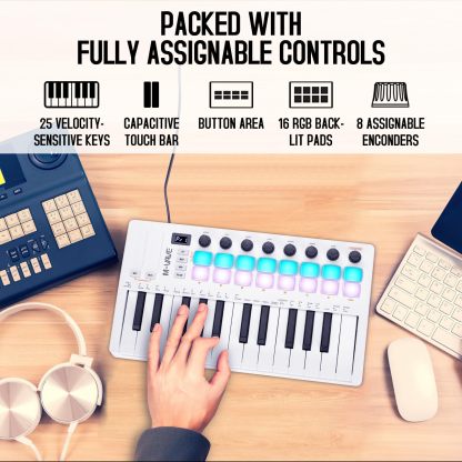 25 Key USB MIDI Keyboard Controller with 16 Backlit Pads,Professional Semi-Weighted Dynamic Bluetooth Keyboard,8 Knobs For Music Production Col White