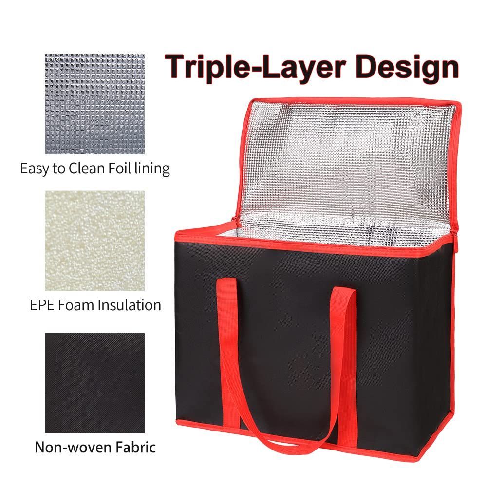 2Pack Black with Red Edge Insulated Reusable Grocery Shopping Bags X-Large Picnic Cooler Bag Zipper Top Cold