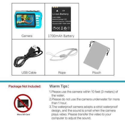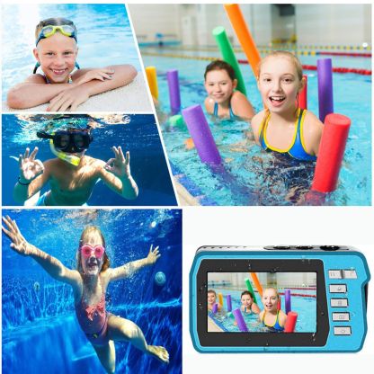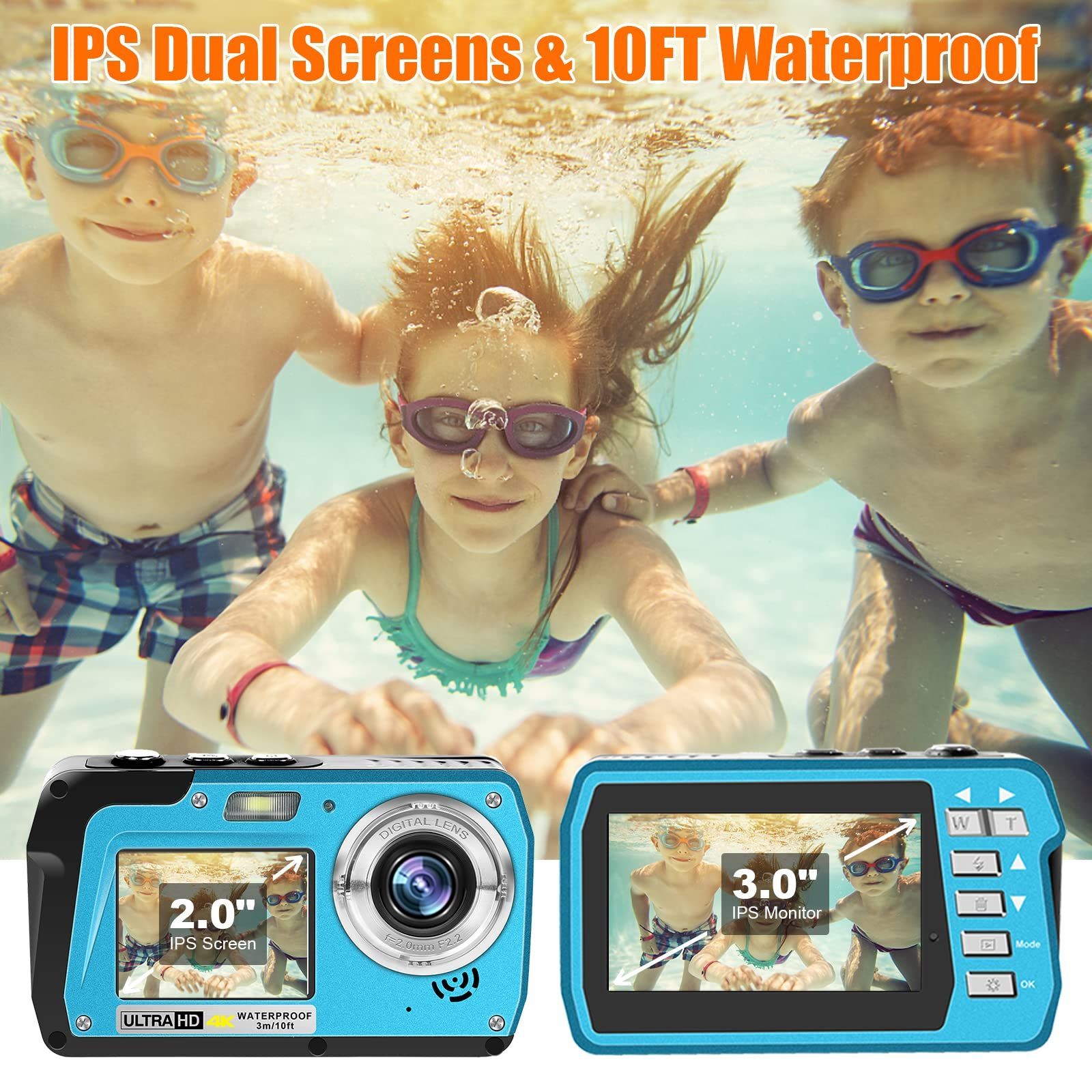 4K 30FPS Waterproof Camera 56MP Underwater Cameras UHD Video Recorder Selfie IPS Dual Screens 10FT Waterproof Digital Camera (Blue)