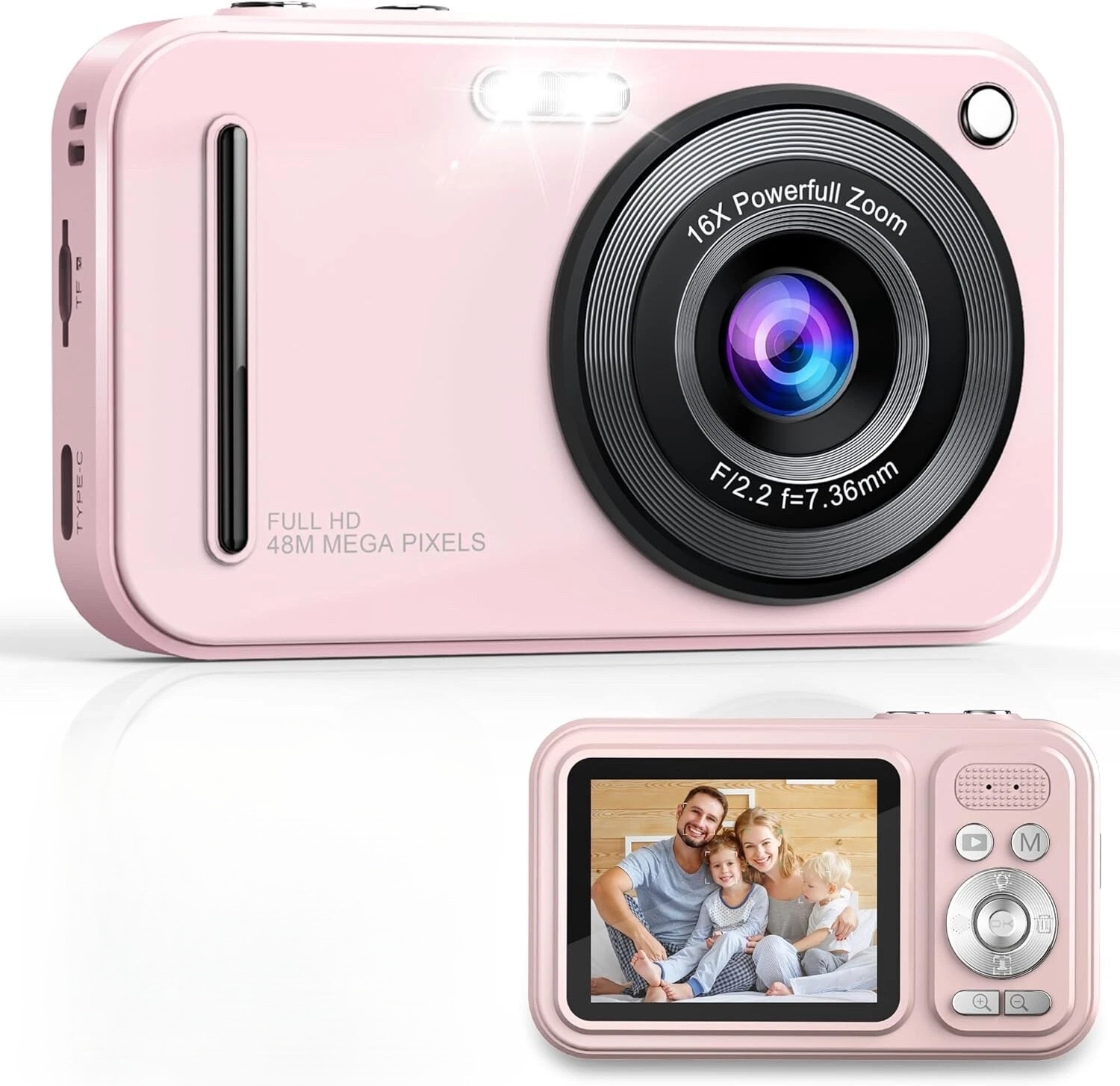 Digital Camera, Autofocus 48MP FHD 1080P Camera for Kids with 16X Zoom Anti Shake, Compact Portable Small Point and Shoot Digital Cameras with 32GB Card, Gifts for Teens Kids Boys Girls, Pink