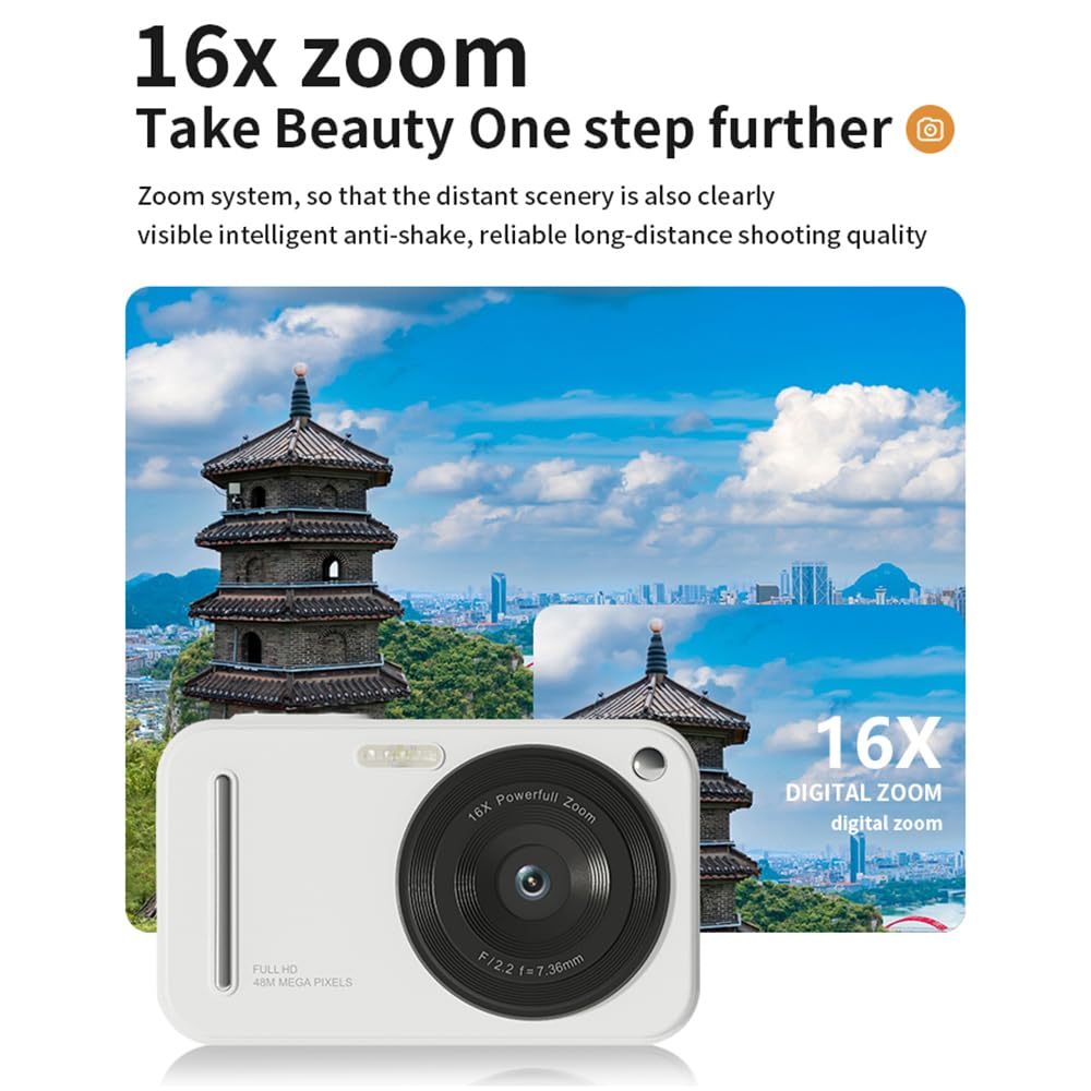 - 16X Digital Zoom And Multi-function:This kids digital camera not only supports 16x digital zoom (you can zoom in or out of the image), but also support autofocus, anti-shake, continuous shooting, timelapse, face and smile detection, self-timer, and more. The digital camera with flash light helps you to take quality pictures in the dark. Easy to operate, press the shutter halfway to autofocus and press the shutter fully to take a picture.