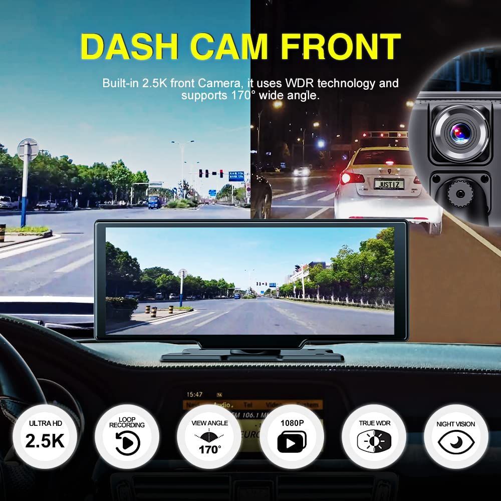1080P Portable Car stereo Dash Cam : The car play dashcam captures clear footage in low-light conditions day or night because of its