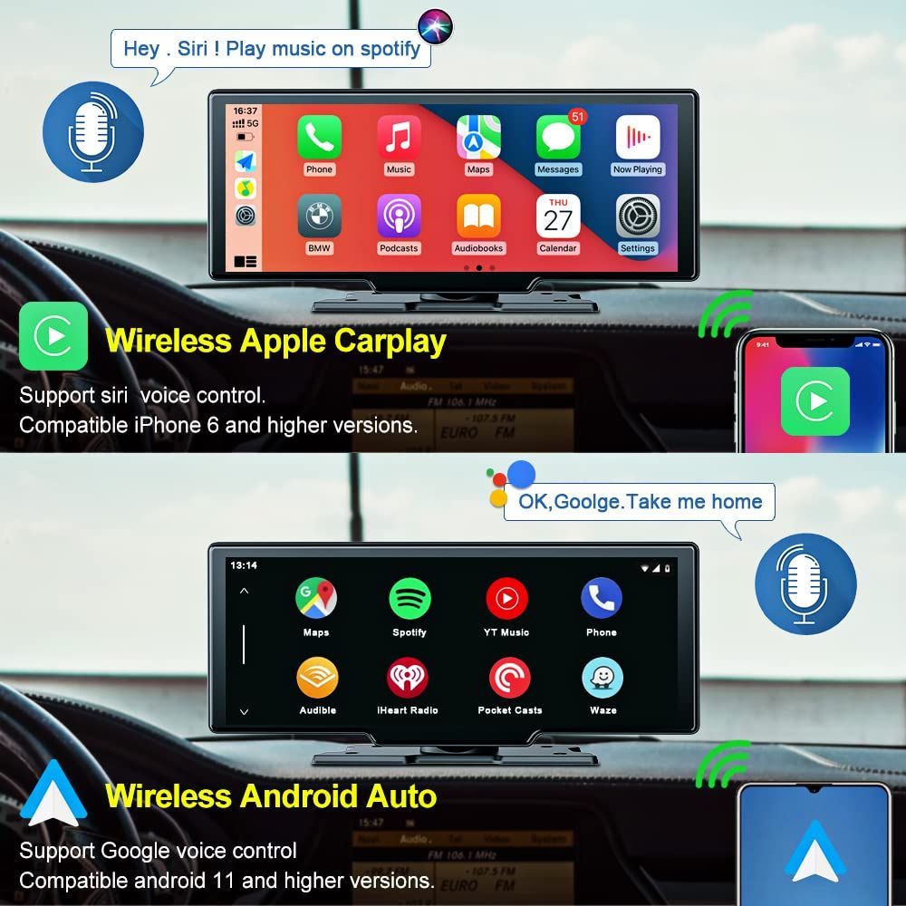 AirPlay & Wireless Mirroring/Backup Camera : The portable Carplay allows users to wirelessly stream audio, games, videos, and images from