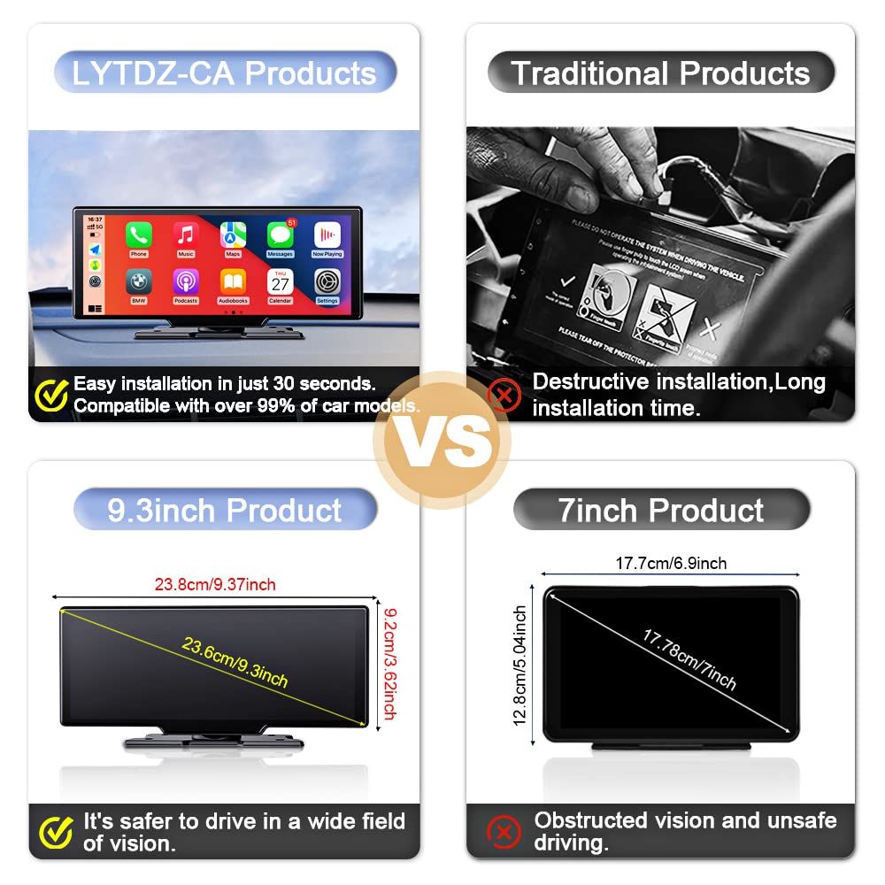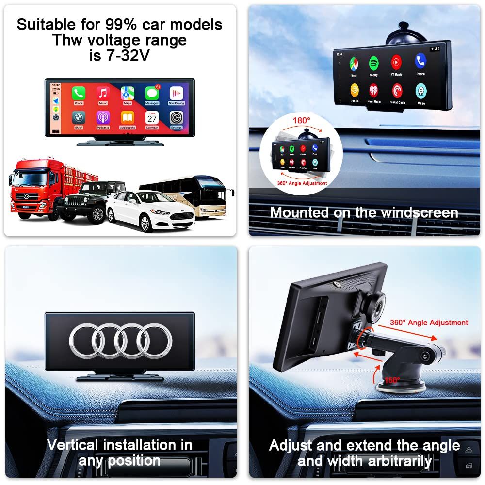 Bluetooth 5.2 / Split-Screen Display : The portable Apple Car Play screen supports bluetooth music playback and hands-free calls, while also