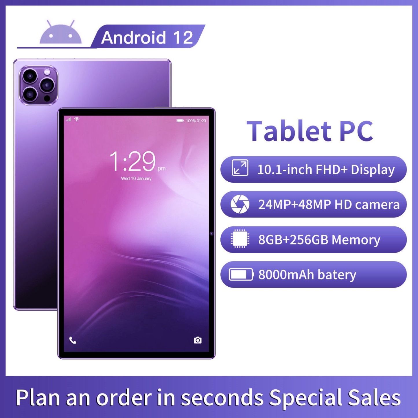 Android 13 Tablet 10.1 Inch 8+256GB IPS HD Screen Bluetooth 24+48MP Dual Camera 4G WiFi Color Purple