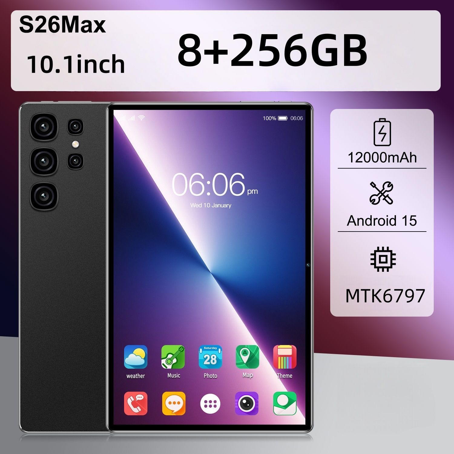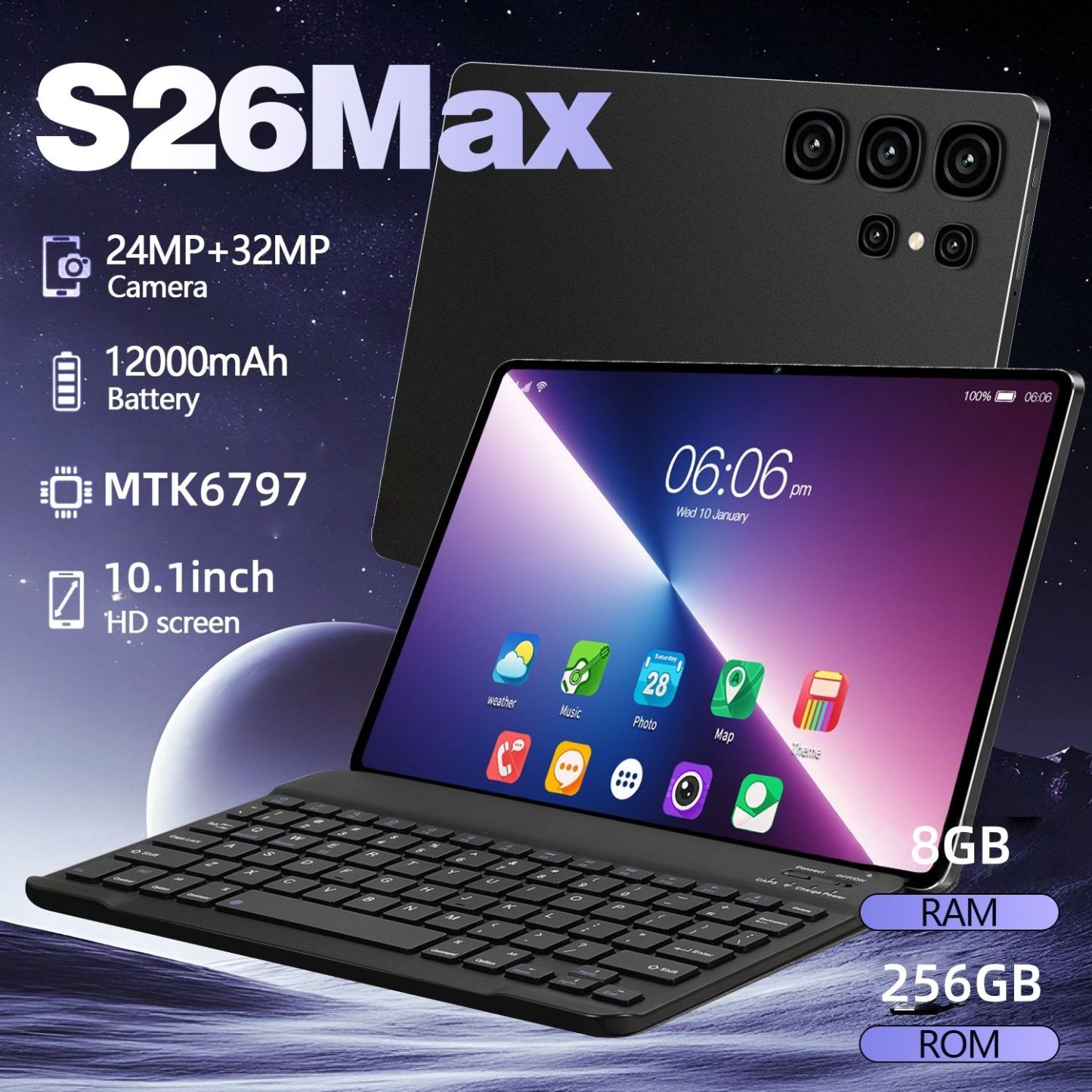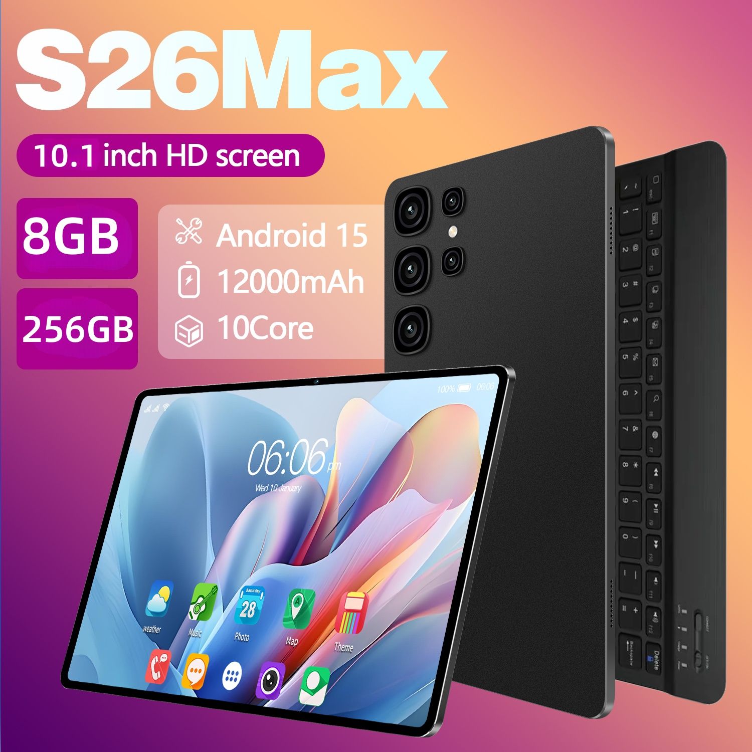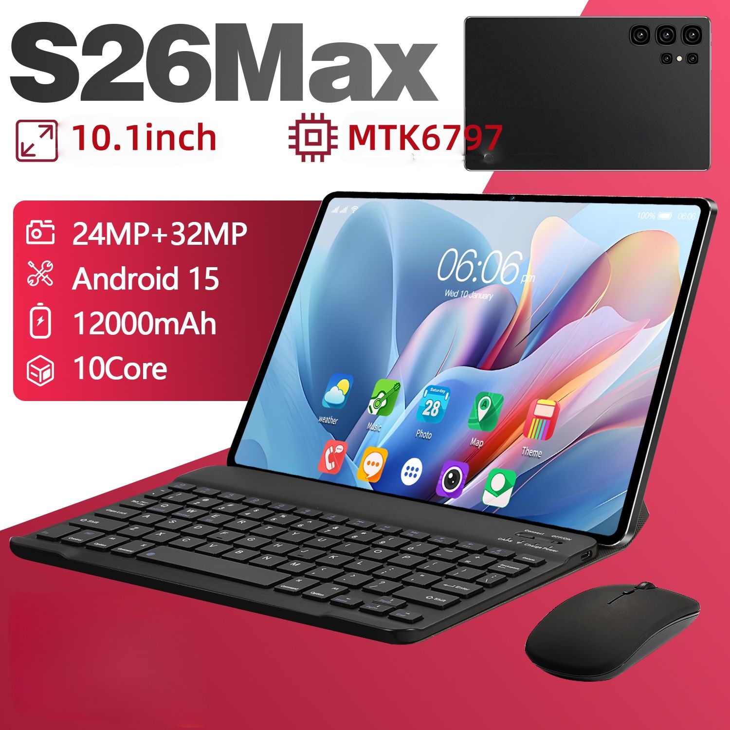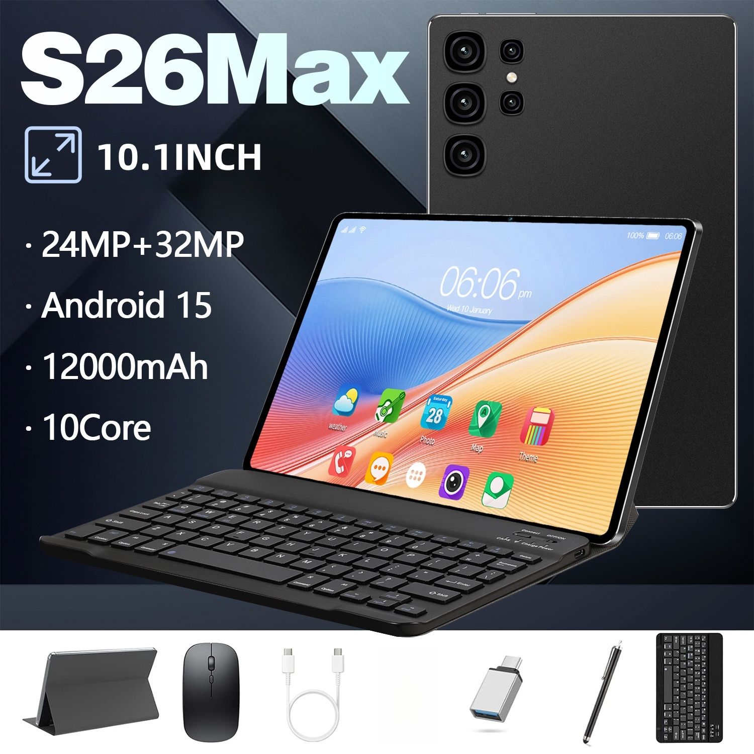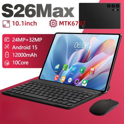Android 15 Tablet 10.1 Inch 10 Core 8GB RAM 256GB ROM 12000mAh Battery HD Screen Keyboard Mouse Included Color Black