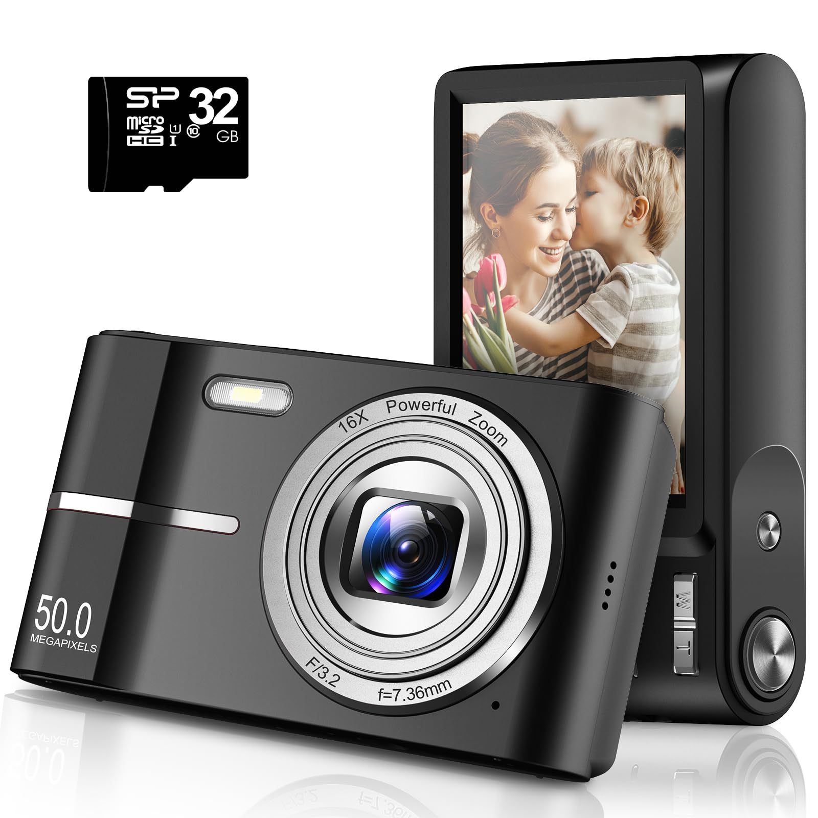 Digital Camera,Autofocus 50MP FHD 1080P Camera with 16x Zoom Anti Shake,Compact Camera for Kid Student Children Teen Girl Boy,Kids Camera with 32GB SD Card,2 Batteries,Black