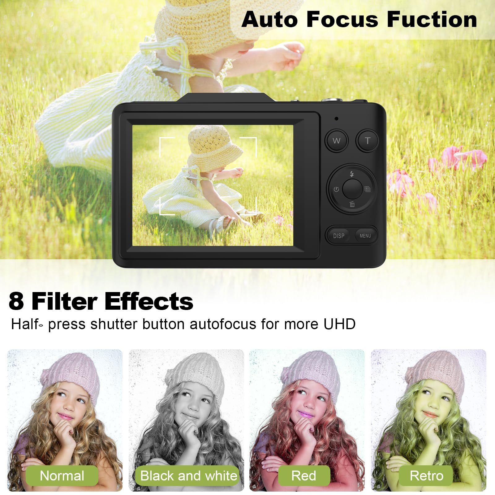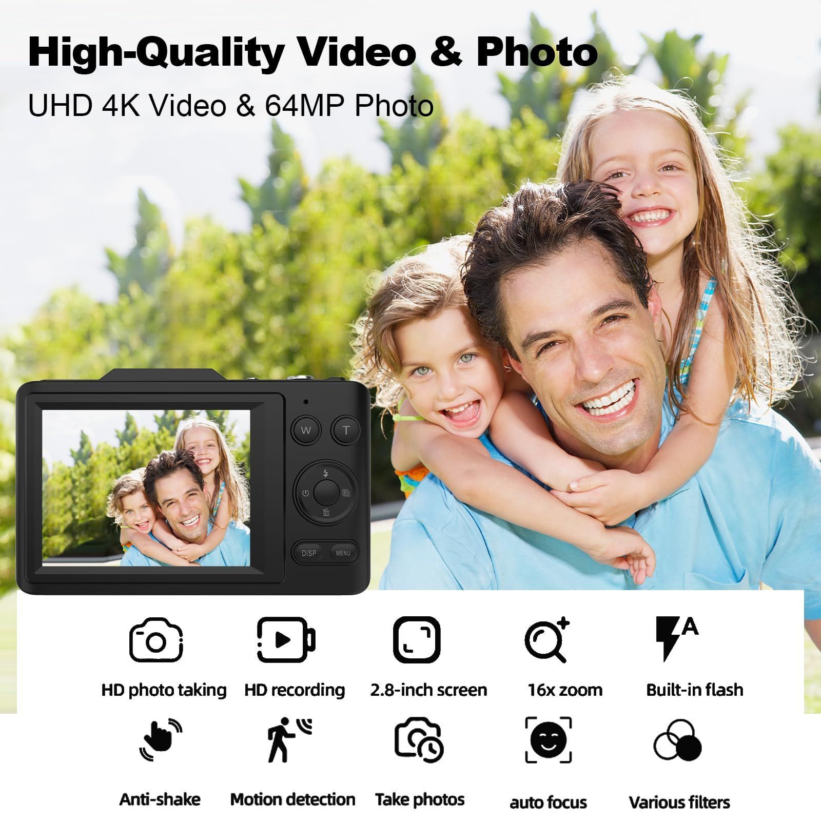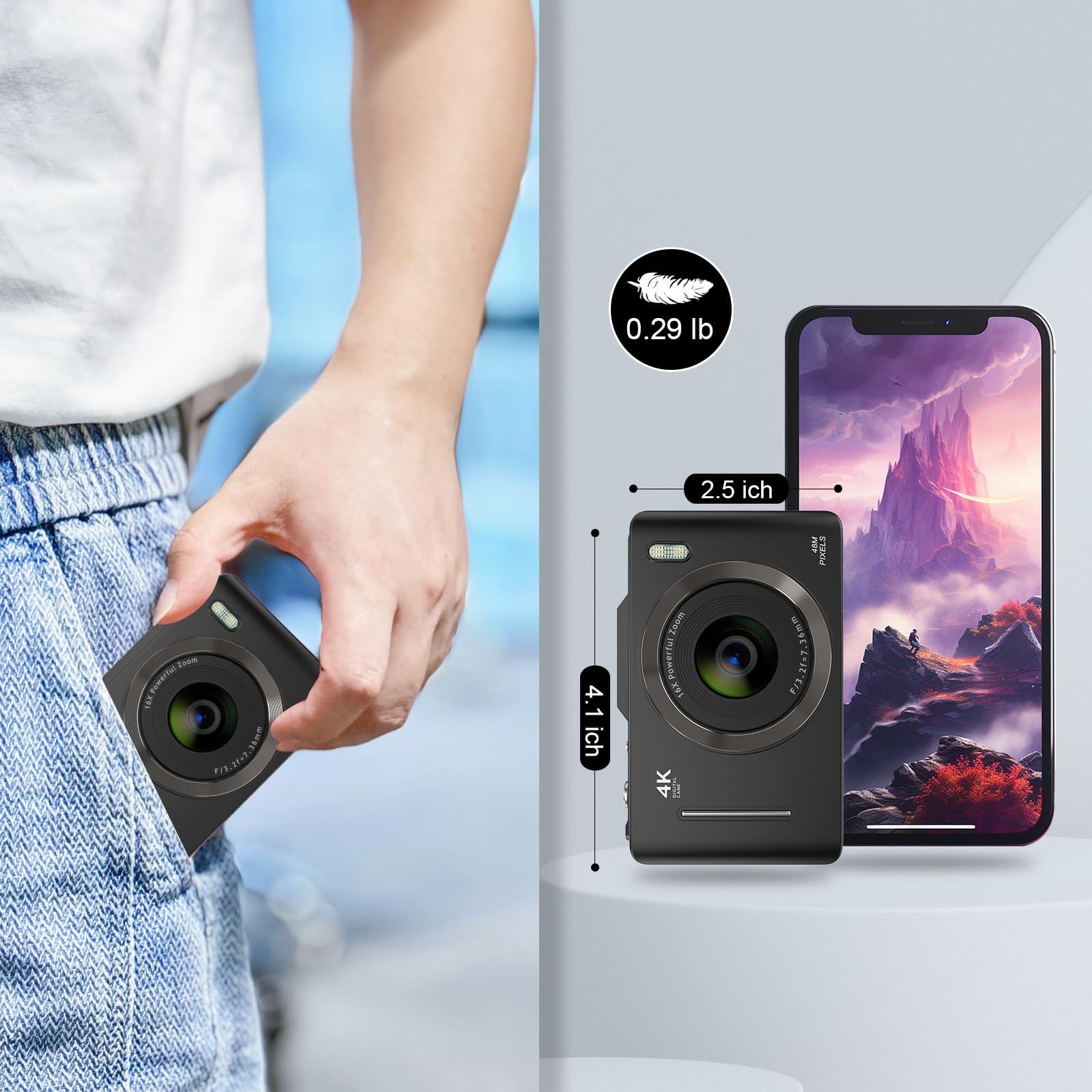 Digital Camera,FHD 4K 48MP Point and Shoot Digital Camera for Kids with 16X Zoom,32GB Card,Anti-Shake,Compact Small Camera,Kids Gift (Black)