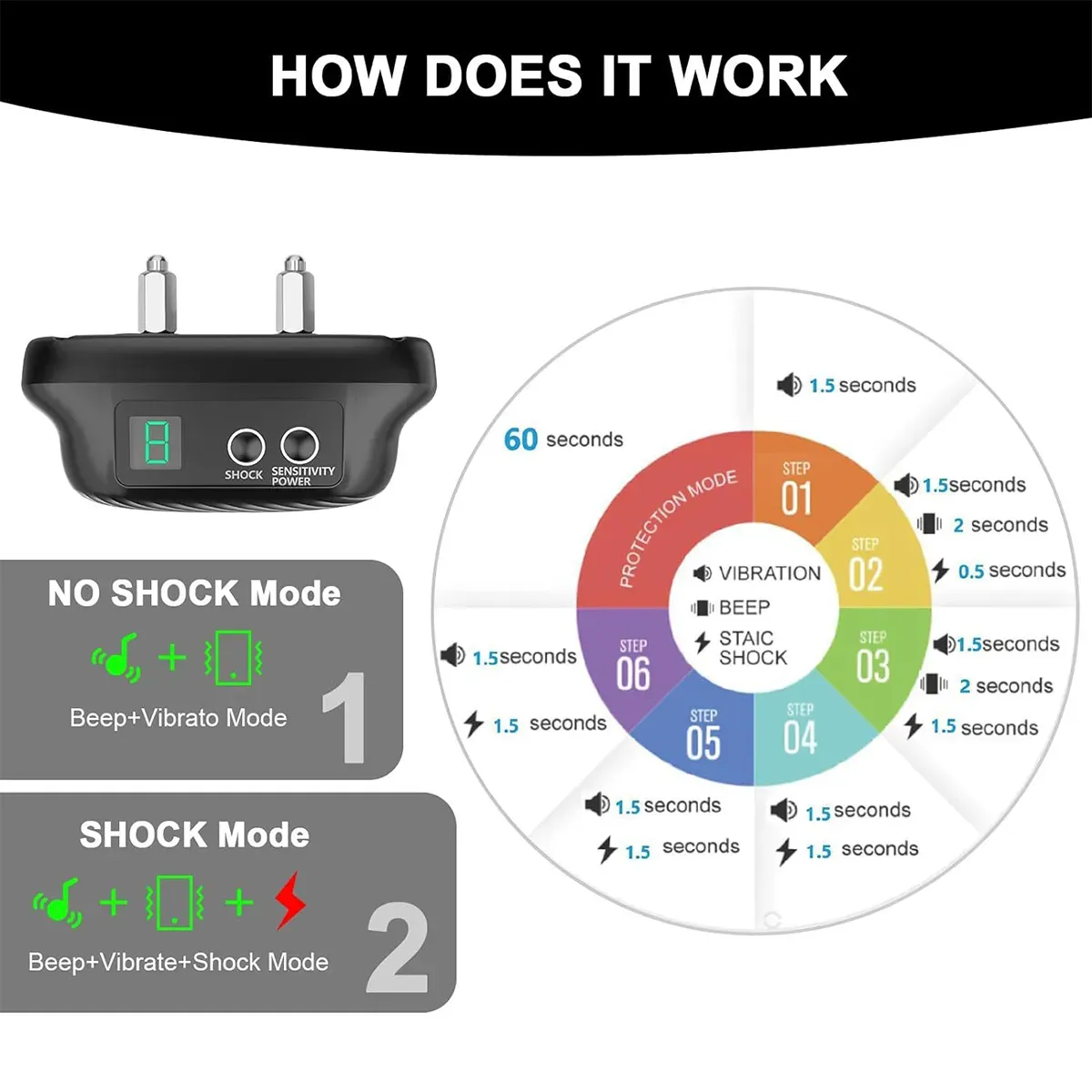 your dog's neck. In Shock Mode, our bark shock collar has a safety shut-off function, the device will temporarily stop working for 1 minute
