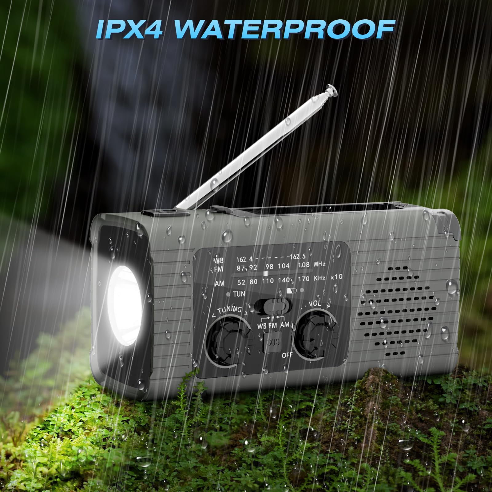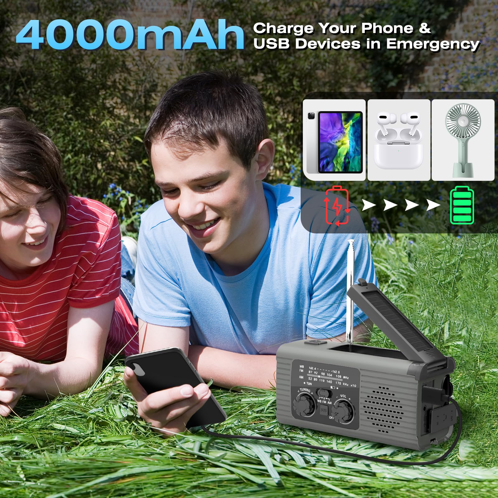 Emergency Radio 4000mAh Solar Hand Crank AM FM NOAA Weather Portable LED Flashlight Reading Lamp SOS Alarm Headphone Jack Indoor Outdoor Grey Survival
