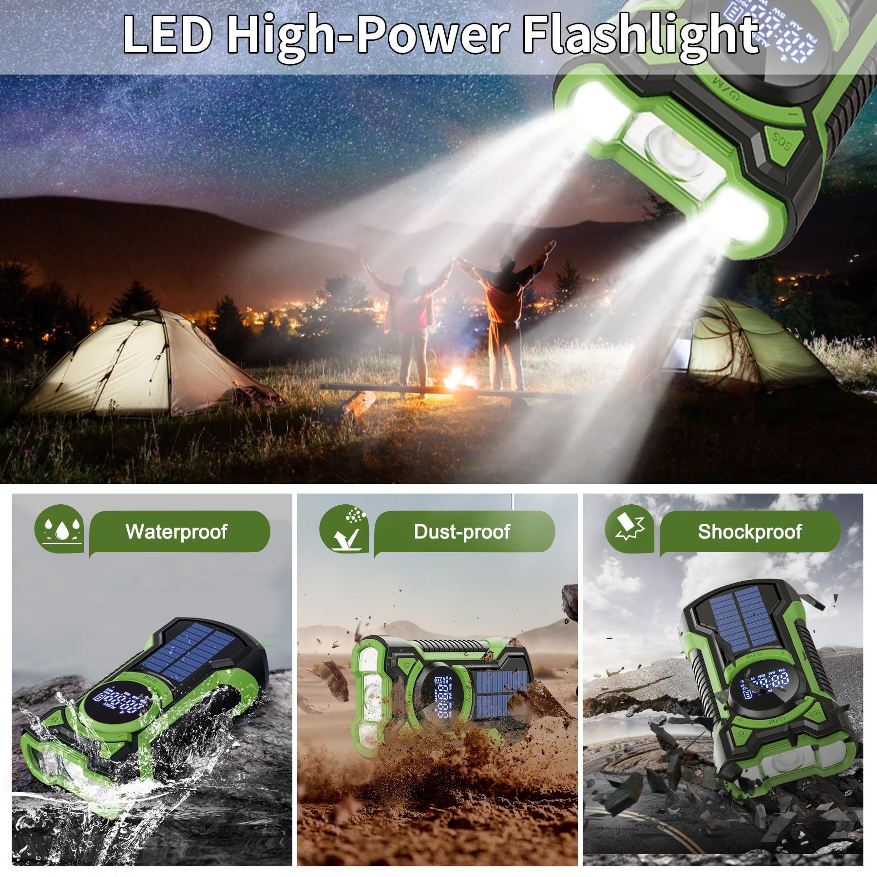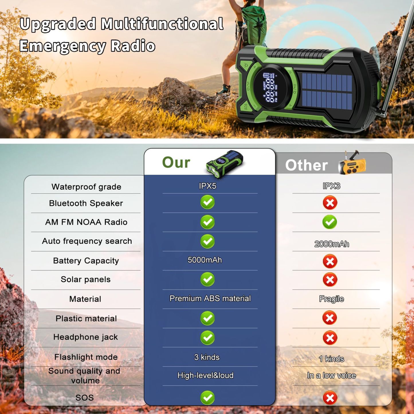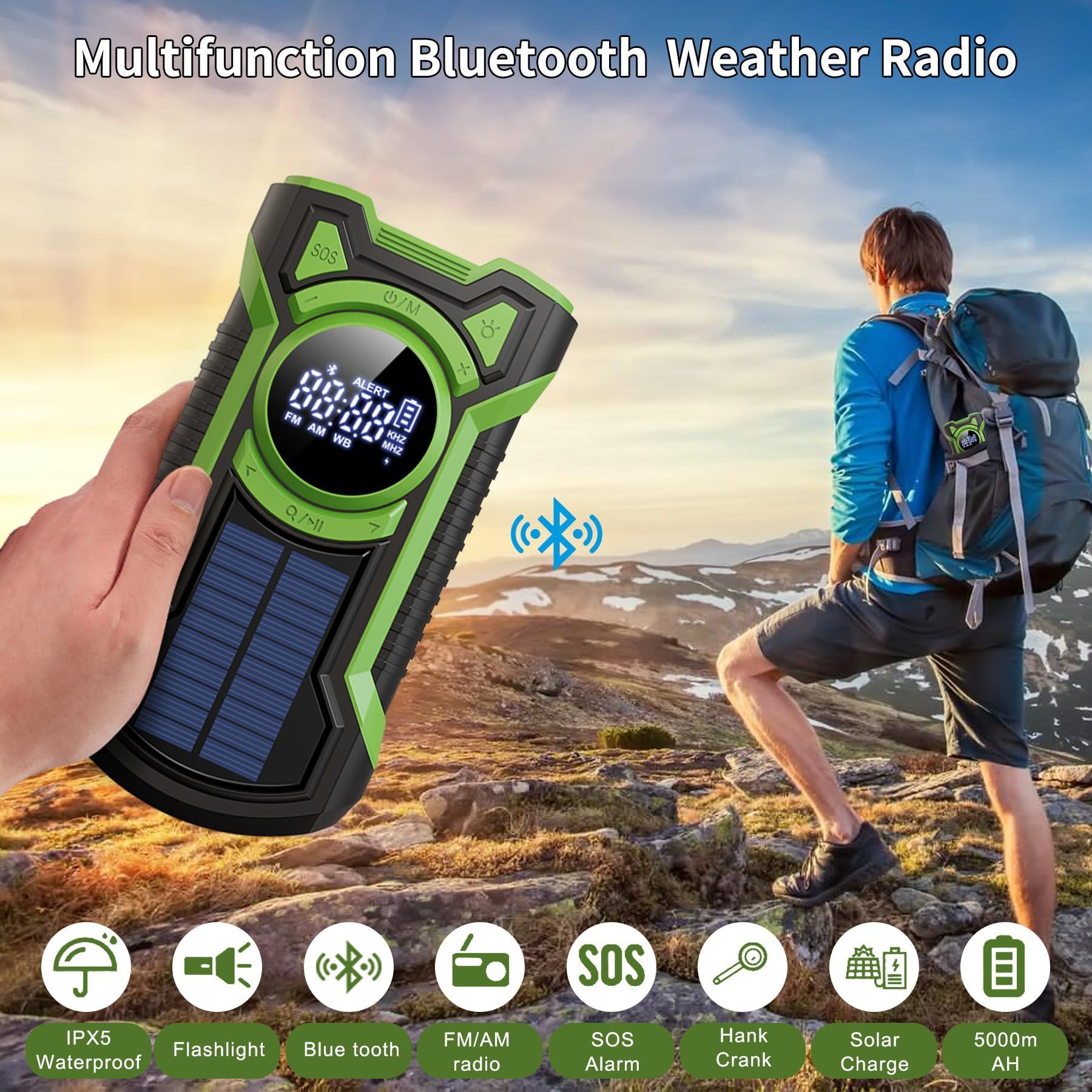 Emergency Weather Radio Waterproof Bluetooth Portable AM FM NOAA Weather Radio with 5000mAh USB Hand Crank Solar Radio Phone Charger Flashlight SOS Green