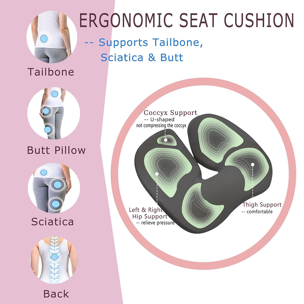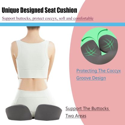 - mprove Posture, Comfortable Seat Cushion: Butt cushion adopts a split design and increases the contact surface between the butt pillow and the buttocks. This design allows the tailbone cushion to maintain a soft and comfortable feeling that wraps the buttocks well, while also allowing the coccyx, sciatica nerve and perianal area to be suspended to avoid squeezing them when sitting down ?