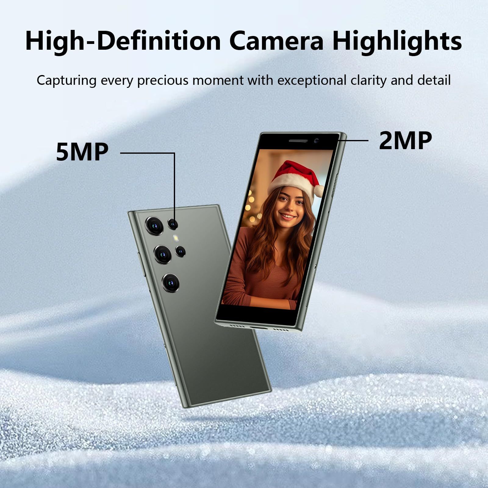 - Dual-Camera small phone : The mini phone features a 2MP front camera and a 5MP rear camera, allowing you to capture clear, sharp photos with ease. Whether you're snapping scenic views, action shots, or taking selfies, this phone ensures high-quality images. It also includes advanced facial recognition technology, adding an extra layer of security to keep your data safe and your privacy protected