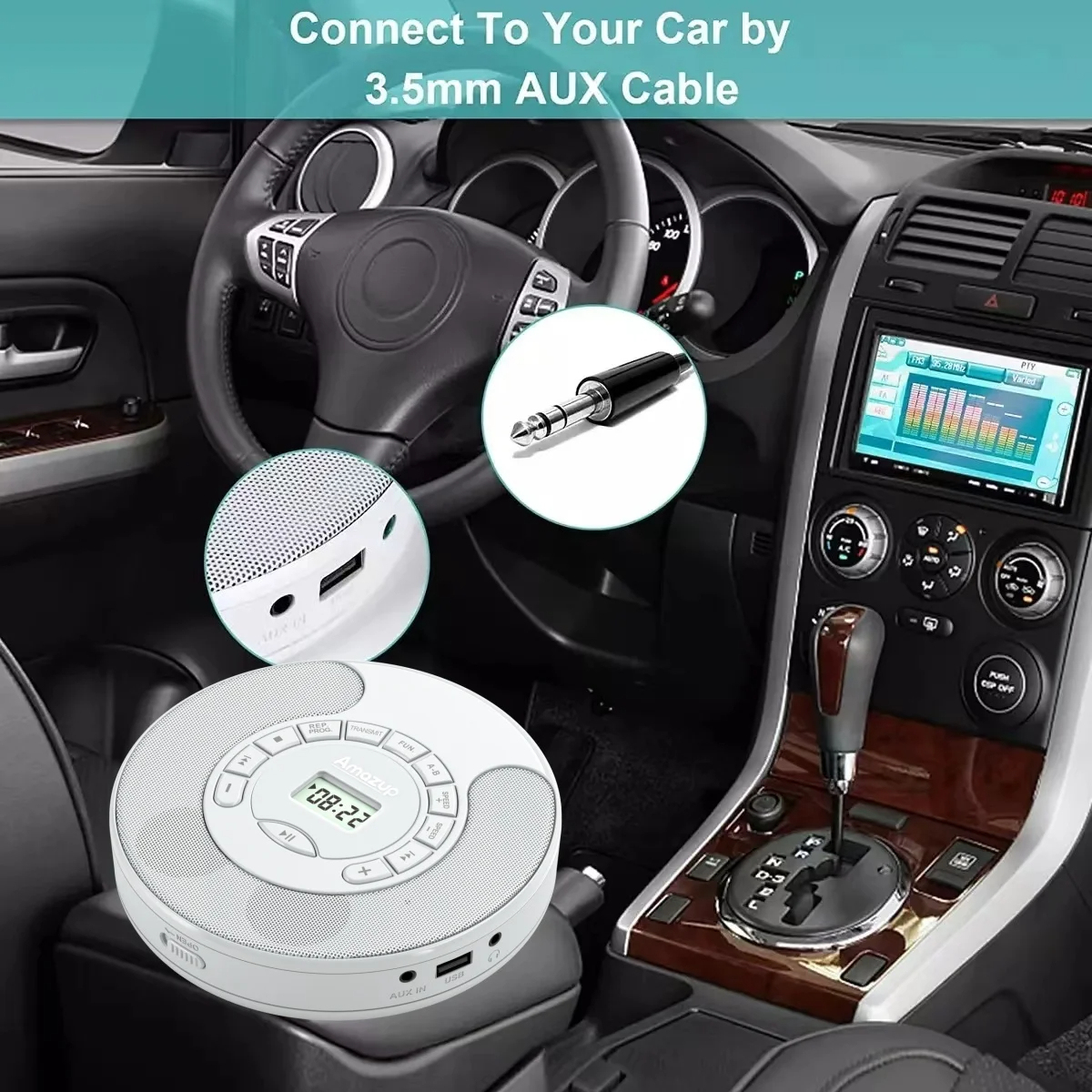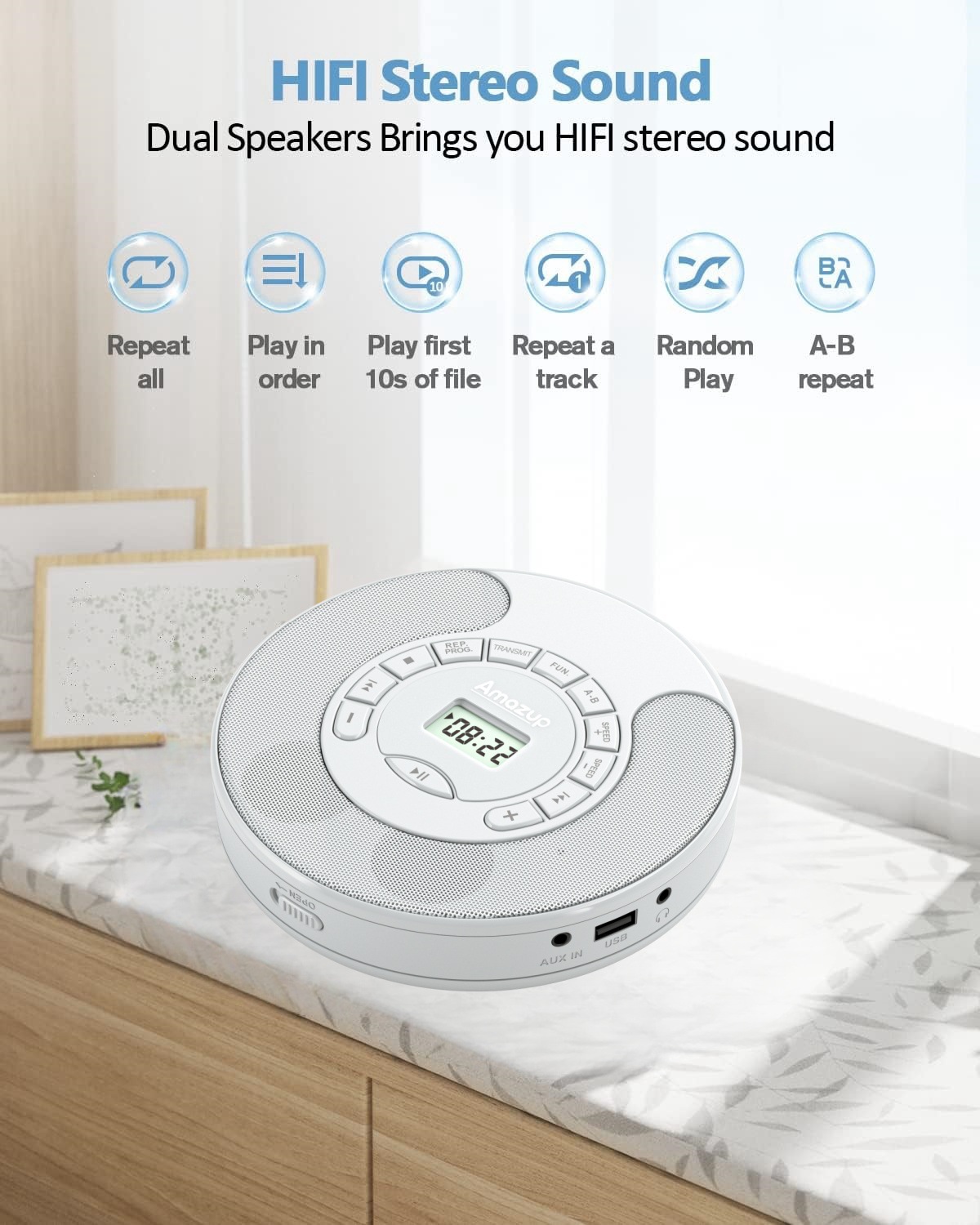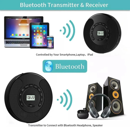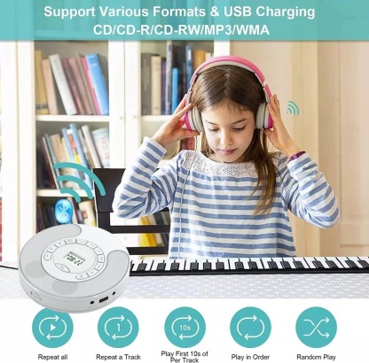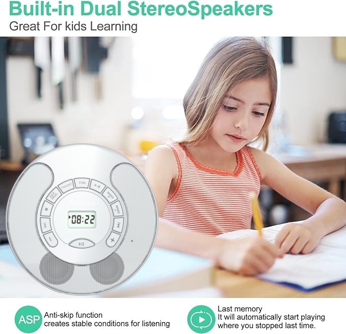 Portable CD Player Rechargeable MP3 Dual Bluetooth Speakers LCD Display Car Home AUX USB White Audio Entertainment