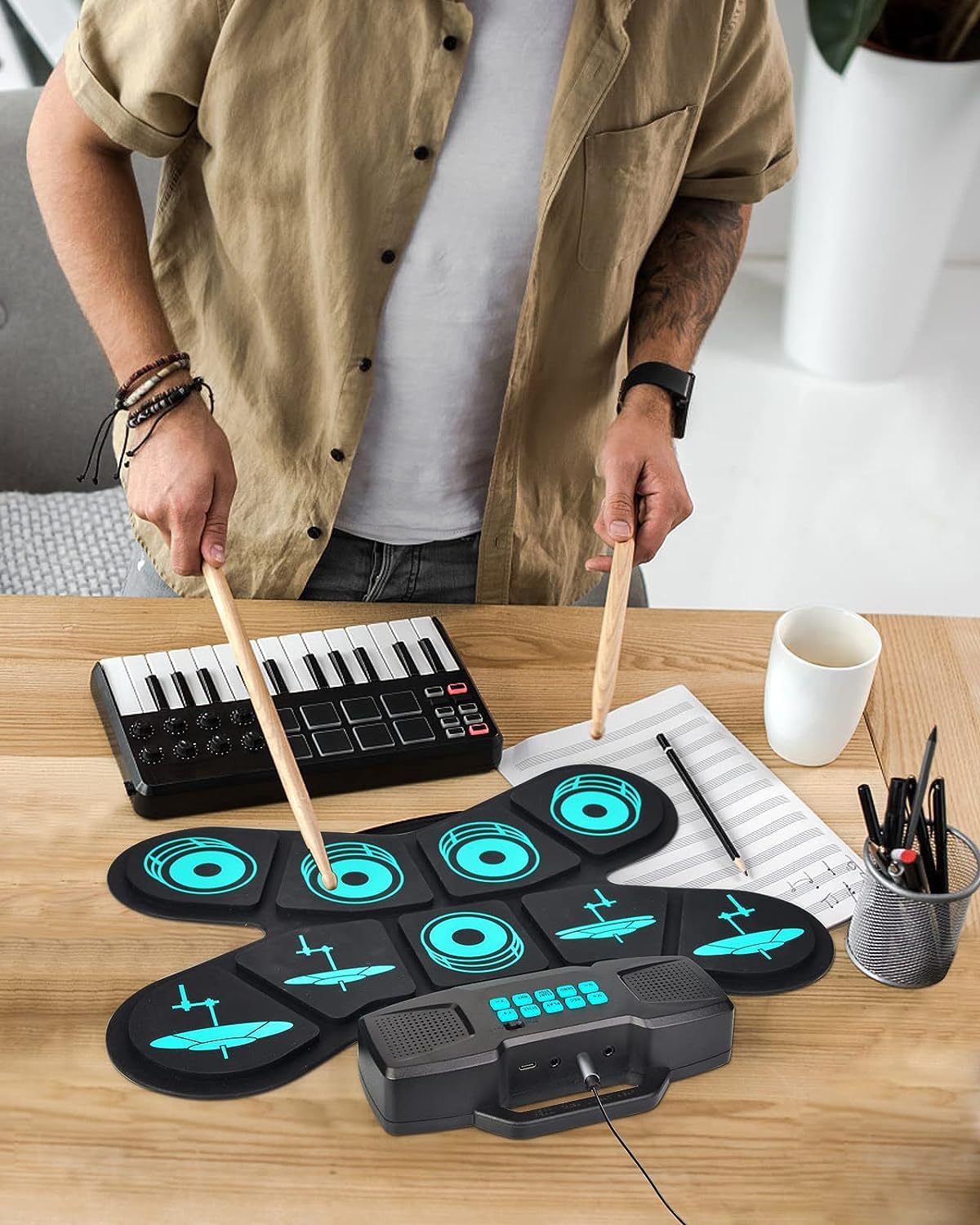 - Easy to Carry:The foldable design of this drum pad makes it easy to roll up the drums and put them in your backpack to take anywhere for outdoor parties and camping; Supports MP3 input, and you can connect headphones to avoid disturbing others even when practicing outdoors.