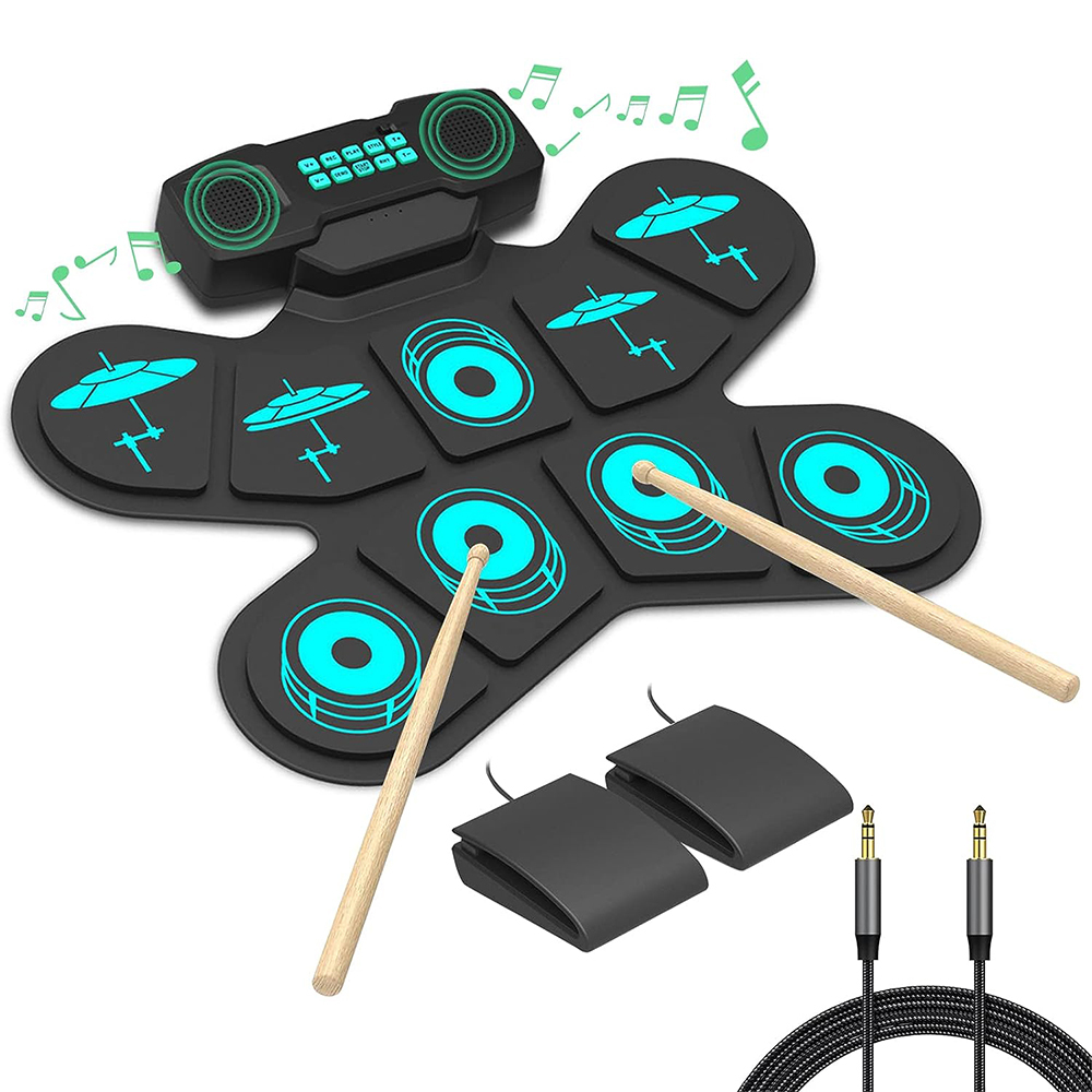 - 9 in 1 Drum Pads: This electronic drum set has 9 di9 in 1 Drum Pads: This electronic drum set has 9 different drum pads, including left/right cymbal, open/close pedal clean, bass drum, bass drum, cymbal bowl, snare drum, treble/bass kick drum and tom. Built-in 7 types of drum kits, 10 demo songs and 10 accompaniments. Produces excellent sound and simulates realistic rhythm effects.