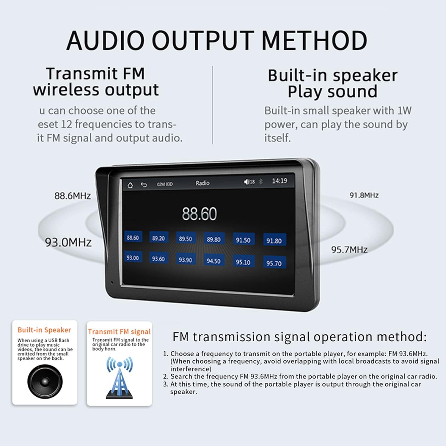 - FM Transmitter:This unit has built-in speaker, but if you want louder sound, you can transfer it to your car's speakers. Car radio can connect to the FM Transmitter frequency-to-frequency wireless transmission, which just need to keep the same channel with the original FM radio. All sounds will be sent to the original car speaker for play.