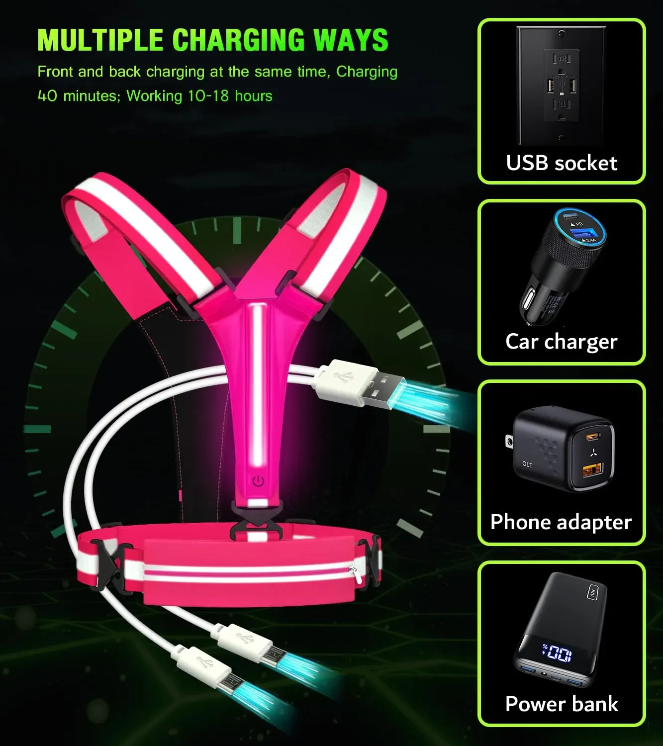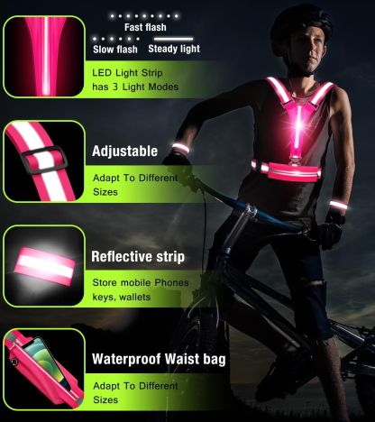 Reflective Vest LED Rechargeable Running Gear High Visibility Armband Waterproof Phone Bag Adjustable Waist Shoulder Pink Safety