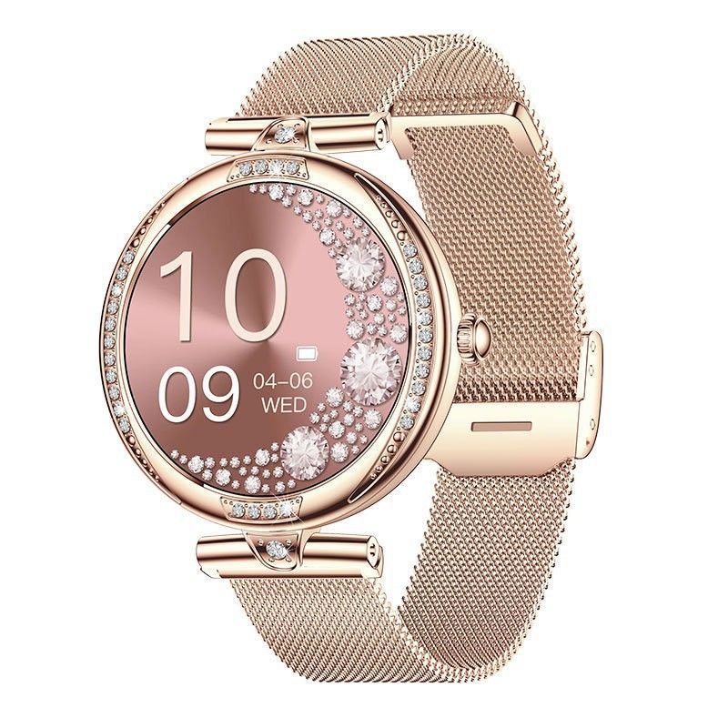 This elegant rosegold smart watch for women combines style and functionality. Its 1.19" AMOLED touchscreen offers vibrant clarity, adorned with 32 sparkling diamonds for a chic look. Monitor heart rate, blood pressure, SpO2, and sleep in real-time with advanced sensors, and track menstrual cycles via the FitCloudPro app. Enjoy Bluetooth calls, message notifications, and over 120 customisable watch faces. With a stainless steel and silicone band, it suits both formal and casual occasions. Rechargeable and durable, it’s the ideal fitness tracker and fashion statement for active women.