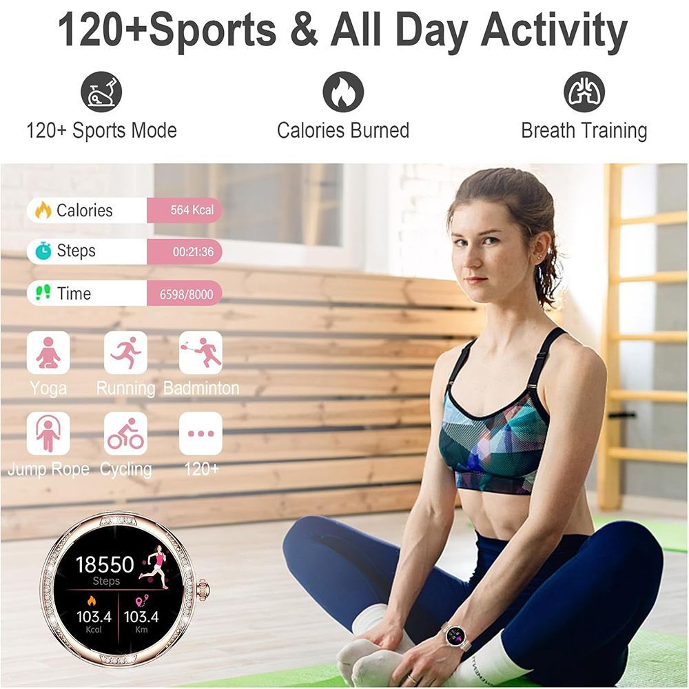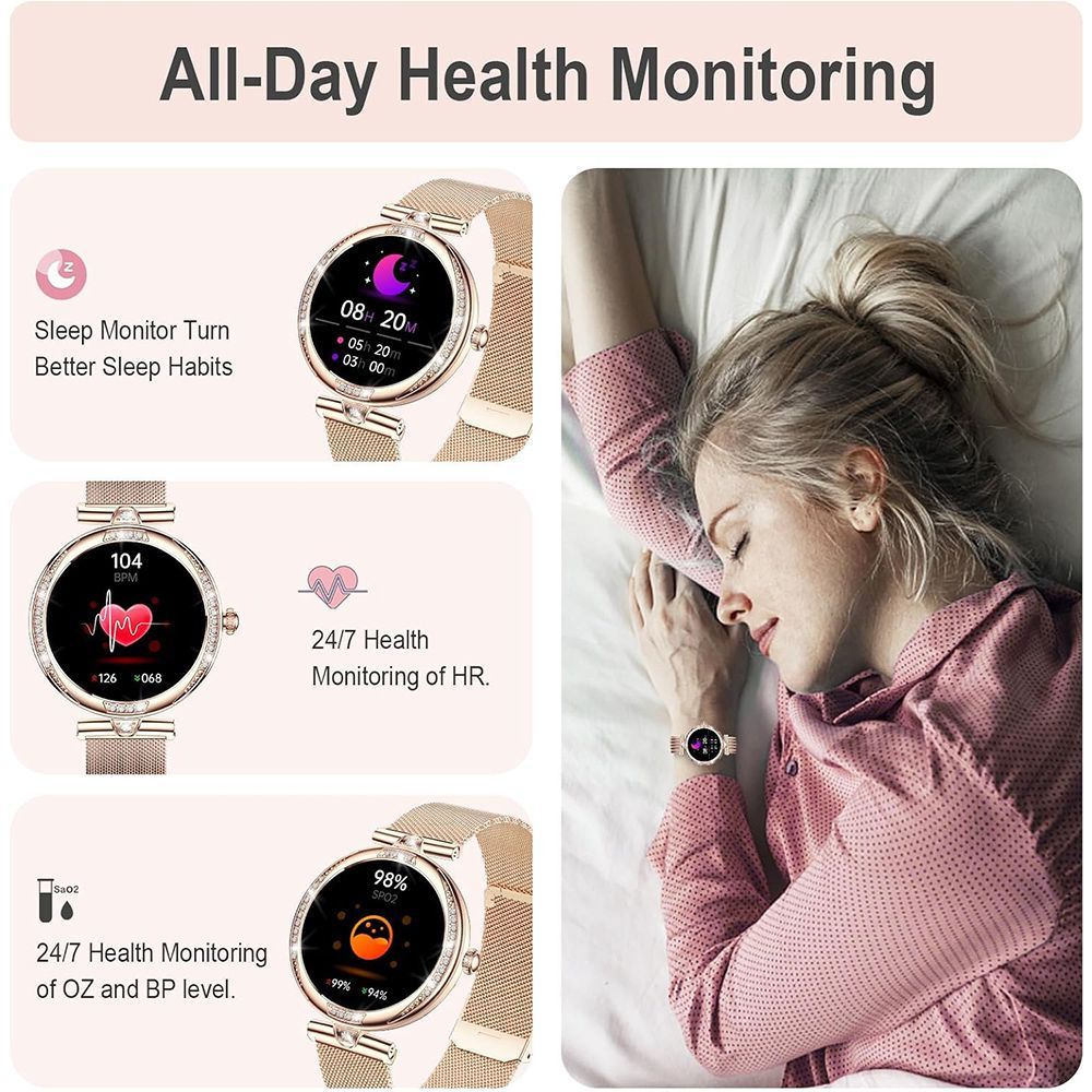 - 24H Health Care Monitor: Smart watches for women use advanced optical sensors,allowing ladies smart watch to real-time monitor health data,such as heart rate,blood oxygen (Sp02),blood pressure throughout the day.helping you understand your health gererally.Fitness tracker women smart watch for women can automatically monitor your sleep status (deep sleep,light sleep, awake) and You can get more health details through the "FitCloudPro",women smart watch can also record a women's menstrual period for thoughtful menstrual management.
