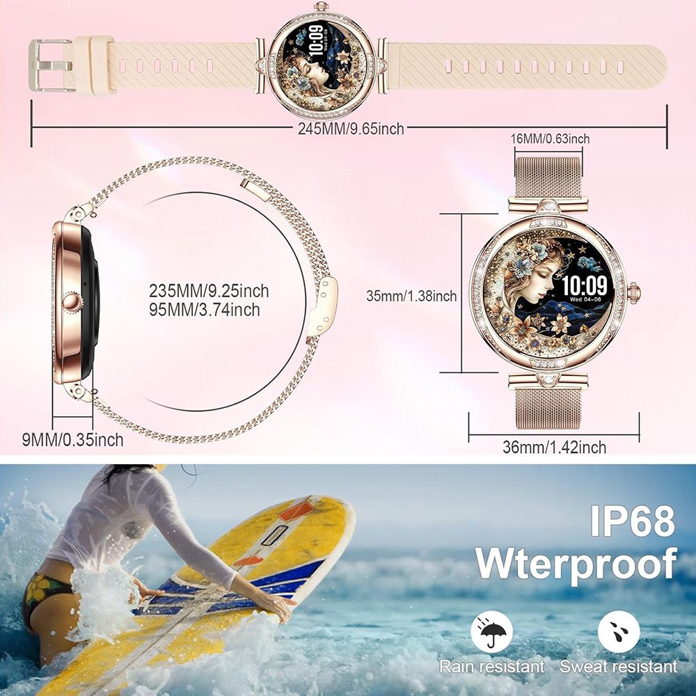 - 1.19 inch AMOLED Smart watches for Women: Smart watch women with 1.1"full touch screen slide smoothly and display clear and colorful,delicate and compact, adjustable brightness providing you with a better visual and operating experience, the AMOLED screen allows you to easily read information in the sun or dark, women samrt watch is embellished with 32 brilliant diamonds,perfectly enhance the stylish of the overall dressier outfit.