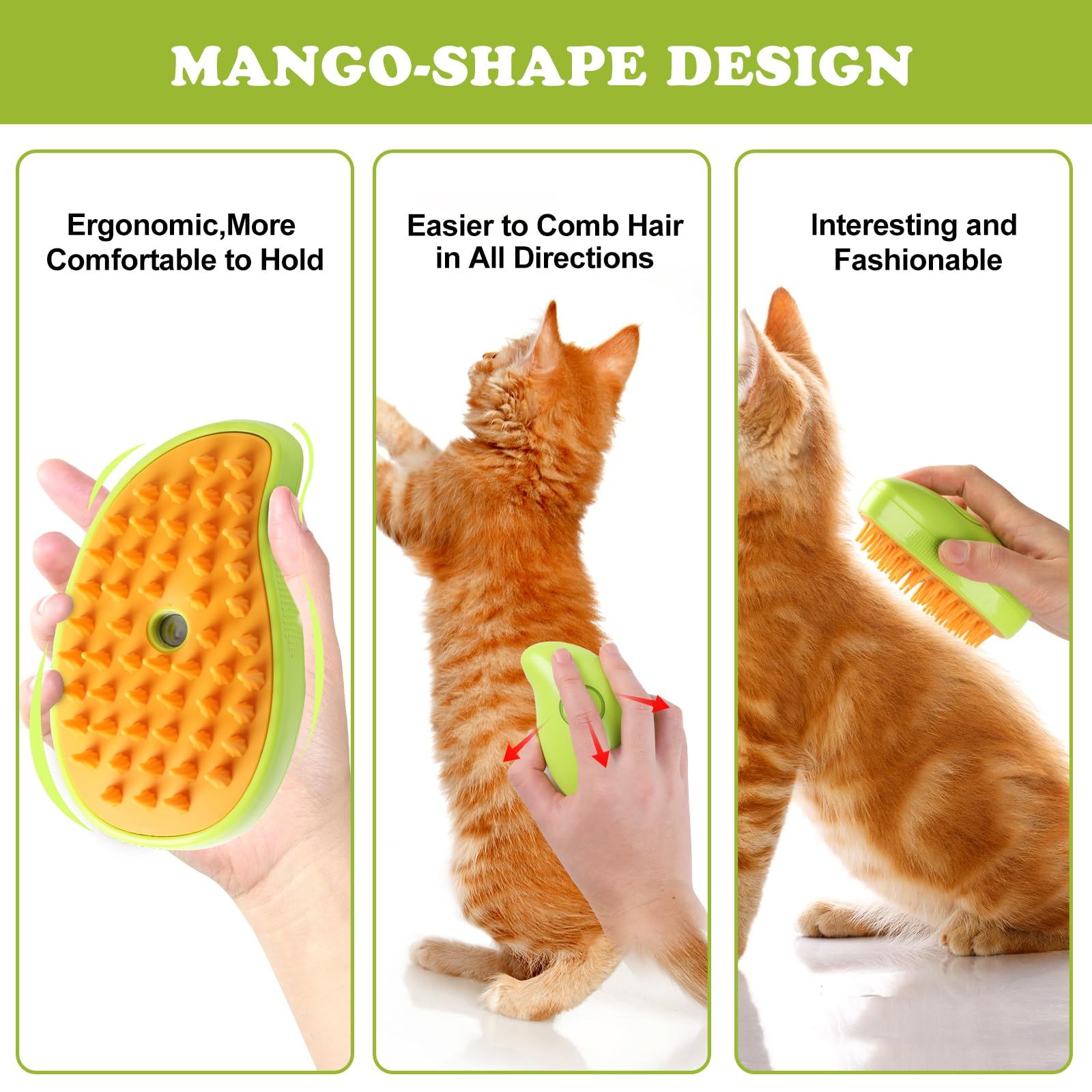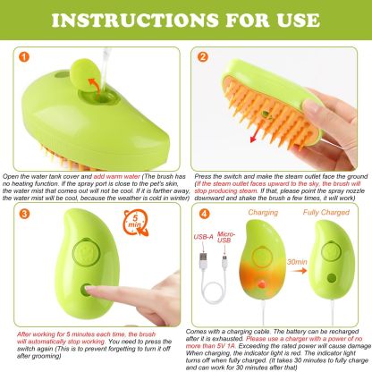 Steamy Cat Grooming Brush Self Cleaning Massage Tool Detangling Loose Hair Remover Pet Shedding 3in1 Green Gentle Skin Safe for Cats