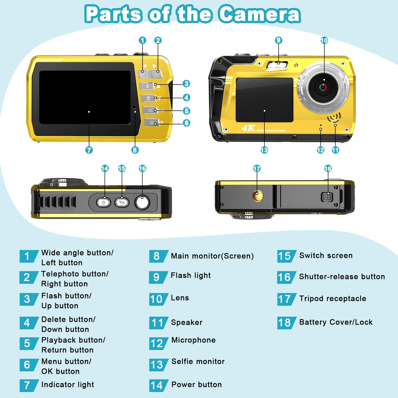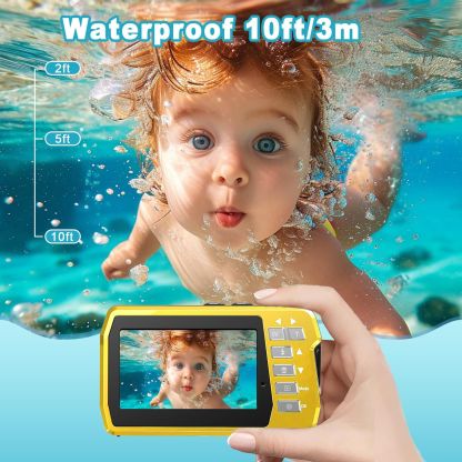 - Rugged and Reliable Design (10FT) : Dive confidently into any aquatic environment with our 10FT waterproof design. Submerge the camera up to a certain depth without worrying about water damage, allowing you to explore and document your underwater escapades without limitations. Plus, with dual screens (3-inch + 2-inch), framing and reviewing your shots is a breeze, both above and below the water's surface.