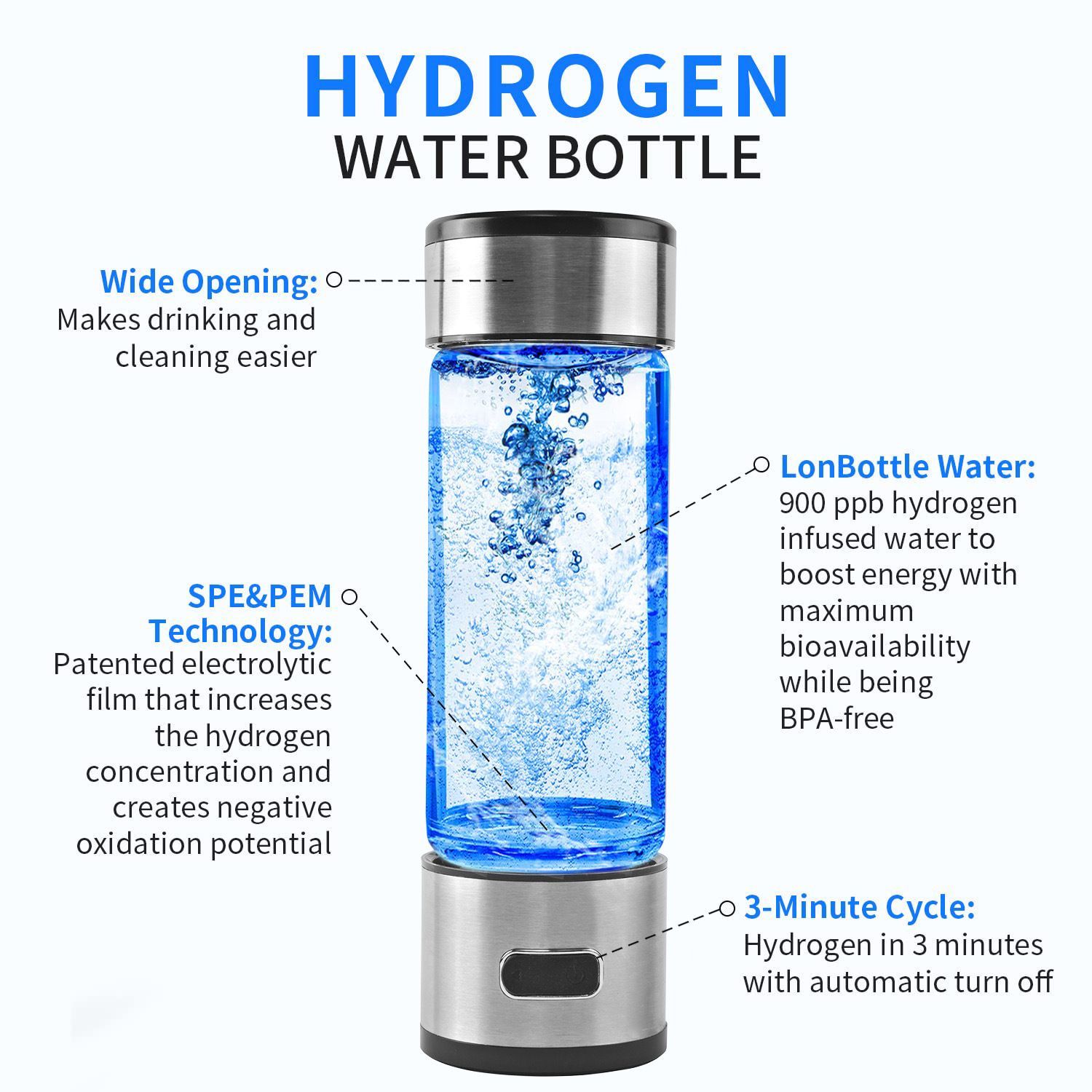 - High-Concentration Hydrogen Water in Mins: In just 3 minutes, produce 1200 ppb of high-concentration hydrogen water (capacity: 380mL/ 12.85oz), or achieve 1600 ppb in 6 minutes using two cycles. A full charge from the hydrogen water generator is sufficient to meet your daily drinking needs. For optimal hydrogen absorption, drink the water within 15-20 minutes of generation. Experience hydrogen-rich water in just a few minutes.