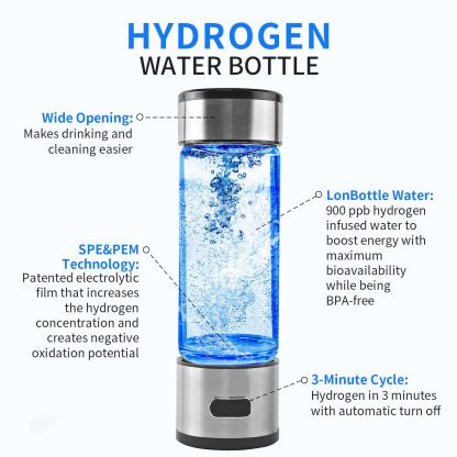 Improve performance while reducing fatigue in daily life with the Water Bottle Hydrogen Portable SPE PEM Technology Ionizer Machine. Combining Solid Polymer Electrolyte (SPE) and Proton Exchange Membrane (PEM) technologies, it separates hydrogen and oxygen through electrolysis, ensuring high-purity hydrogen infusion into your water. The catalytic particles produce hydrogen at the anode while releasing oxygen at the cathode, promoting health with an increased hydrogen supply and free radical synthesis. Drinking 1.5 liters of hydrogen water daily can boost metabolism, alleviate muscle soreness, improve sleep quality, and support overall health, offering antioxidant effects comparable to consuming multiple servings of fruits and vegetables. In just 3 minutes, it produces 1200 ppb of high-concentration hydrogen water, or 1600 ppb in 6 minutes with a double cycle. Crafted from premium borosilicate glass, it ensures safety and durability.