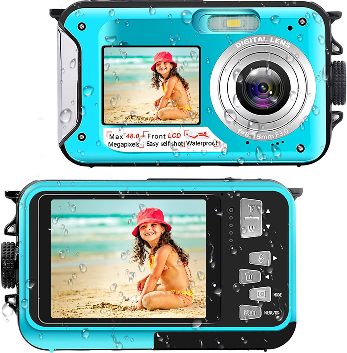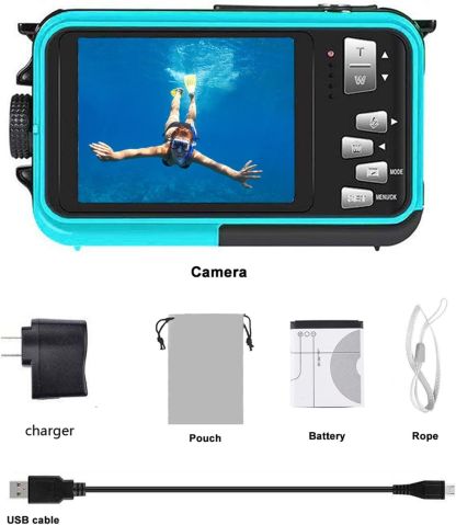 Waterproof Camera Underwater Cameras for Snorkeling Full HD 2.7K 48MP Video Recorder Selfie Dual Screens 10ft 16X Digital Zoom Blue